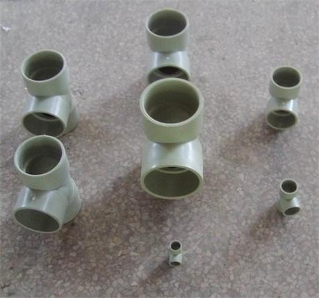 模壓成型:又稱壓制成型,這種方法是將原材料置于模具內,借助壓力和熱量作用,使物料熔化充滿型腔,形成與型腔相同的制品。在經過加熱使其固化,冷卻后脫模,制成的模壓管件。